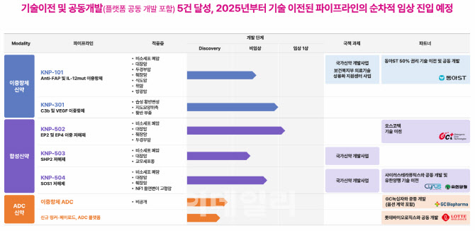 동아에스티에 기술이전한 항FAP 및 IL-12 변이 타깃 이중항체 ‘KNP-101’은 50% 권리만 이전하면서 총 계약규모 2030억원에 계약금 50억원을 수령했다. 오스코텍에 기술이전한 EP2 및 EP4 이중저해제인 ‘KNP-502’는 총규모는 비공개했고 계약금 20억원을 수령했다. 유한양행과의 SOS1 저해제 ‘KNP-504’ 계약규모는 2080억원, 계약금 60억원은 공동개발사인 사이러스테라퓨틱스와 절반씩 수령했다. 롯데바이오로직스와, 녹십자와의 ADC 계약규모는 모두 비공개에 부쳤다.