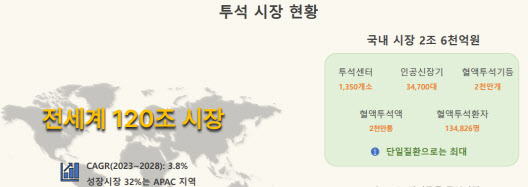 국내 투석 관련 시장은 2023년 기준 2조 6000억원 규모로 추정된다. 국내 투석센터는 1350개소, 혈액 투석 환자는 13만 4826명에 이른다. 투석은 단일 질환으로 최대 시장 규모로 알려졌다. 글로벌 투석 시장 규모는 2028년 120조원에 달할 것으로 예상된다.