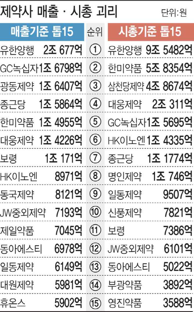 [이데일리 임정요 기자] 국내 헬스케어·바이오 섹터를 논하면서 제약사를 언급하지 않을 수 없다. 지난 1897년 설립한 국내 최초 제약사 동화약품(000020)부터 빅파마 기술재이전으로 글로벌 폐암 신약을 탄생시킨 유한양행(000100)까지. ‘만년적자’ 신약개발사와 비교할수 없는 규모의 연매출과 순이익을 자랑하는 이들이지만, 시가총액은 외려 작다.