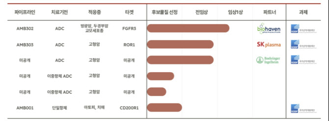 회사가 이미 기술수출에 성공한 AMB302, AMB303, ODS025 외 현재 보유하고 있는 파이프라인 중 공개된 것은 이중항체ADC인 고형암치료제 2건과 아토피 및 치매치료제로 개발 중인 AMB001까지 총 3가지다. 이밖에 삼성바이오로직스의 ‘ADC 툴박스 프로그램’ 공동개발 파트너로 참여해 공동개발도 진행 중이다.