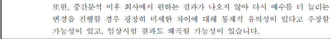 E 위원은 “중간분석 결과를 검토한 후 다시 연구설계를 변경하는 것은 통계학 관점에서 적절하지 않다”고 지적했다.