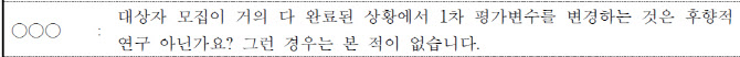 이 회의에서 A 위원은 “대상자 모집이 거의 다 완료된 상황에서 1차 평가변수를 변경하는 것은 후향적 연구 아닌가”라며 “이런 경우는 본 적이 없다”며 강하게 반발했다.