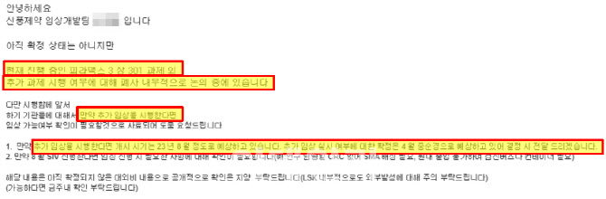 해당 메일에서 임상개발팀 김00은 “피라맥스 임상 3상 301과제 외 추가 과제 시행 여부에 대해 신풍제약 내부적으로 논의 중에 있다”고 밝히며 “추가 임상 시행시기는 2023년 8월로 예상하고 있다”고 밝혔다. 이어 “추가 임상 실시 여부에 대한 확정은 4월 중순에 이뤄질 것”이라고 덧붙엿다.
