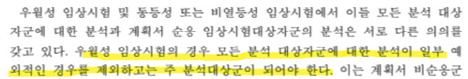 하위그룹으로 품목허가를 받는 것도 현실성이 떨어진다. 식약처의 의약품 임상시험 통계 가이드라인[민원인 안내서](3상) 5.2 분석 대상군은 ‘주분석군’이 대상이 돼야한다고 명시하고 있다. 더욱이 ‘5.1 사전에 구체화된 분석계획에 시 고려사항’ 항목에서 ‘탐색시험은 확증적인 결과를 목적으로 하지 않는다’고 밝히고 있다.