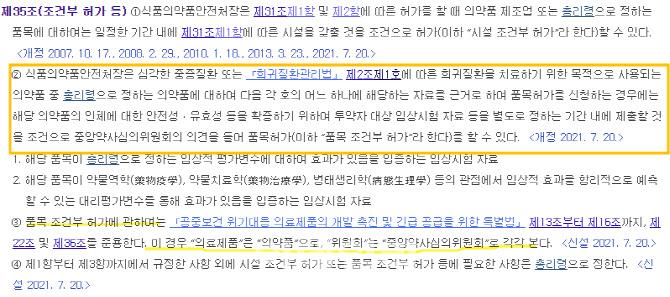 약사법 제35조 2항에 따르면 의약품 조건부 허가는 중앙약사심의위원회 의견을 들어 품목허가를 할 수 있다’고 명시돼 있다.