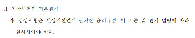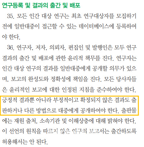 국내에서 진행하는 모든 임상시험은 ‘의약품 임상시험 관리기준(제30조 제1항 관련)’을 준수해야 한다. 이 기준에 따르면 헬싱키 선언에 근거한 윤리규정, 기준, 관계 법령에 따라야 한다고 명시하고 있다. 헬싱키 선언은 △연구 결과를 일반 대중에 공개할 의무가 있고 △긍정적 결과뿐만 아니라, 부정적이고 확정되지 않은 결과도 대중에게 공개해야 한다 등의 내용을 주요 골자로 하고 있다.