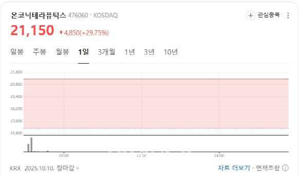 Stock Split and Drug Optimism Lift Onconic Onconic Therapeutics soared 29.75% to 21,150 won, hitting the daily limit-up. Analysts attributed the sharp rise to a mix of optimism surrounding its oncology drug candidate Nesuparib and the technical effect of a recent stock split (bonus issue).