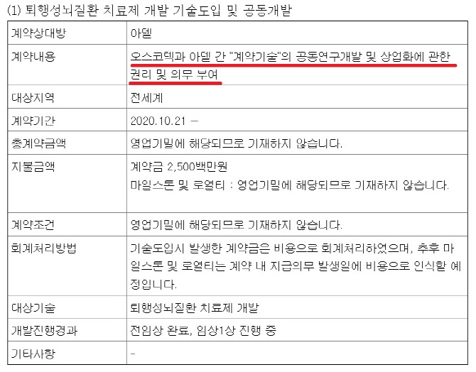 | | 오스코텍이 아델과 체결한 기술도입 계약. (이미지=전자공시 시스템) |