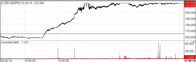 According to KG Zeroin’s MP Doctor(formerly Market Point), shares of D&D Pharmatech closed at 215,500, up 29.90% from the previous day. The stock initially traded weaker but reversed course around 1 p.m. and surged into the close.
