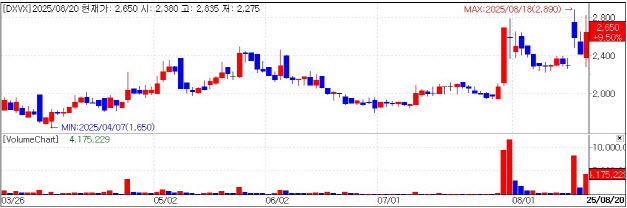 DXVX Eyes Additional Export Deals DXVX shares rose as much as 17.15% intraday to 2,830 won before closing at 2,650 won, up 9.50%. Since July 29, the stock has surged 35.48%. Analysts attributed the rally to back-to-back licensing-out contracts and heightened expectations for more.
