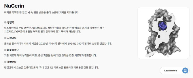 샤페론 관계자는 “알츠하이머는 병의 진행을 근본적으로 바꿀 수 있는 치료 옵션이 제한적인 영역으로, 최근에는 신경 염증을 조절하는 새로운 기전에 대한 연구가 활발하다”며 “누세린은 염증복합체 억제 플랫폼을 뇌 질환으로 확장한 사례로, 임상 1상 결과를 토대로 후속 임상과 글로벌 사업화 전략을 구체화해 나갈 계획”이라고 말했다.