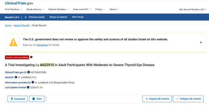 룬드벡은 지난 14일(현지시간) 'Lu AG22515'(APB-A1) 갑상선안병증(TED) 임상 1상의 환자 모집이 완료됐다고 업데이트했다.(자료=클리니컬트라이얼스(Clinical Trials))