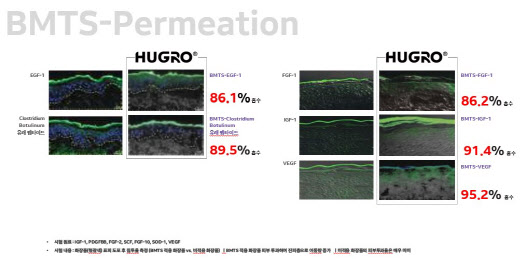 자체 실험 결과 휴그로 기술을 적용한 EGF의 피부 침투율은 86.1%, FGF는 86.7%, IGF는 91.4%, VEGF는 95.2% 등 매우 높은 수치를 기록했다. 바이오플러스 관계자는 “일반적인 성장인자 펩타이드는 경피 투과가 불가능하다”며 “바이오플러스는 생물학적 기능을 회복시키는 성장인자들에 휴그로 기술을 적용해 피부를 개선시키고 치료한다”고 설명했다.