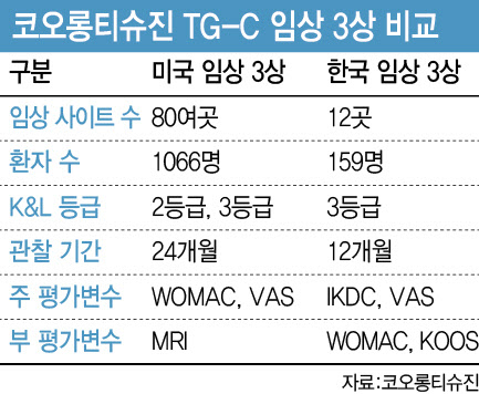 하지만 코오롱티슈진은 임상 3상은 구조적인 손상의 회복보다 환자 관절의 기능적인 부분과 통증을 줄이 것에 더 집중돼 있는 만큼 임상 데이터 측면에서는 문제가 없을 것으로 전망하고 있다.