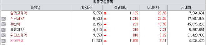 이날 KG제로인 엠피닥터(MP DORTOR·옛 마켓포인트)에 따르면 알리코제약은 직전 거래일보다 가격제한폭인 29.99%(1165원) 상승해 5050원에 장을 마감했다.