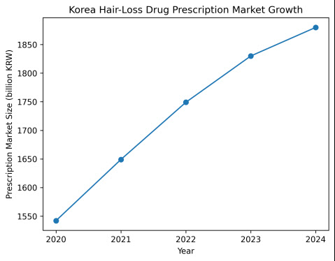 의약품 시장조사기관 아이큐비아에 따르면 지난해 국내 탈모치료제 시장의 규모는 1880억원에 이른다. 탈모약 처방액은 2020년 1542억원, 2021년 1649억원, 2022년 1749억원, 2023년 1830억원, 지난해 1880억원 순으로 커졌다. 이는 남성형 탈모(안드로겐 탈모증)에 쓰이는 전문의약품을 대상으로 집계한 결과다.