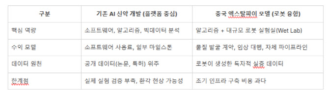 | | 국내 AI신약개발 기업과 중국 모델 비교표 (자료=각사) |