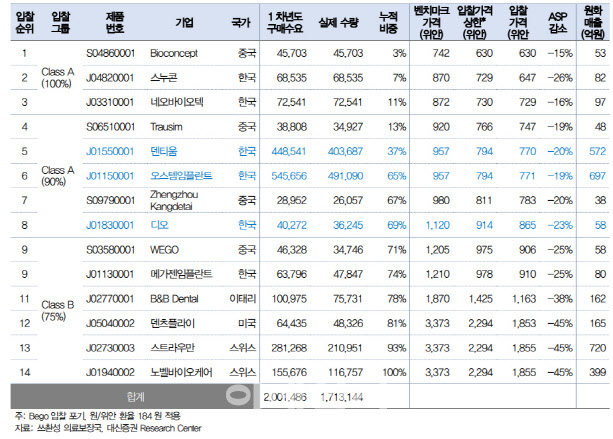 | 임플란트 VBP 입찰 결과 정리. (단위:위안, %, 억원) |