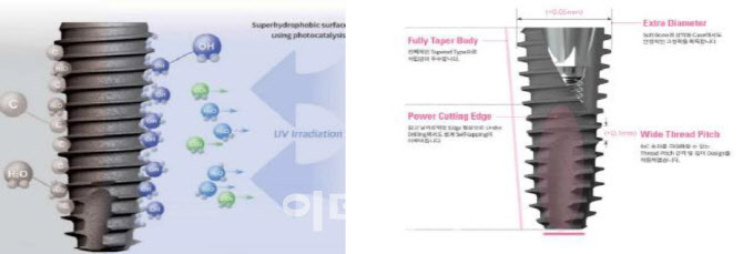 임플란트에 자외선(UV) 처리를 하면 표면에 탄화수소가 제거된다. 또, 물을 튕겨내는 소수성 성질의 전하 상태가 물을 빨아들이는 친수성으로 전환된다. 그만큼 혈액, 세포, 단백질이 표면에 잘 달라붙는다.