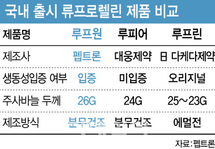 국내 류프로렐린 시장에는 오리지널약인 루프린외에도 대웅제약(069620)의 루피어, 동국제약(086450)의 ‘로렐린’ 등이 있다. 하지만 제네릭 중에서는 루프원과 로렐린만이 루프린과의 생물학적 동등성(BE)을 입증한 상태다.