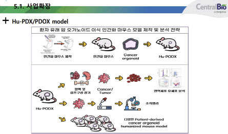 센트럴바이오는 PDO와 PDOX의 차별화된 기술 확보를 위해 관련 전문기업과 협업을 진행하고 있다. 정밀의료 기반 바이오기업 엠비디가 파트너다. PDO는 환자 암 조직에서 세포를 분리해 시험관(in vitro)에서 3차원 구조로 배양한 ‘미니 종양’ 모델이다. 환자 종양의 유전적·표현형적 특성을 비교적 충실히 보존하고, 수십~수백 종의 약물을 동시에 스크리닝 가능해 저비용·고속 약물 평가라는 장점이 있다. 하지만 혈관, 면역세포, 기질 같은 실제 종양 미세환경(TME)은 반영하기 어렵다는 단점이 있다.