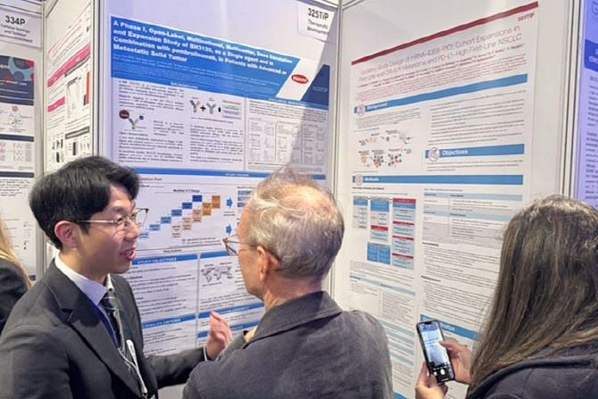 한미약품 ONCO임상팀 김성중 선임연구원이 지난달 11일(현지시각) 영국 런던에서 열린 유럽종양학회 면역종양학 학술대회(ESMO Immuno-Oncology Congress 2025)에서 차세대 면역항암제 BH3120의 임상 경과가 담긴 포스터 내용을 설명하고 있다. (사진=한미약품)