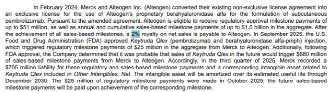 | | 알테오젠의 키트루다 큐렉스 로열티 비율이 순매출의 2%라고 명시돼 있다. (자료=MSD의 3분기 보고서(FORM 10-Q)) |
