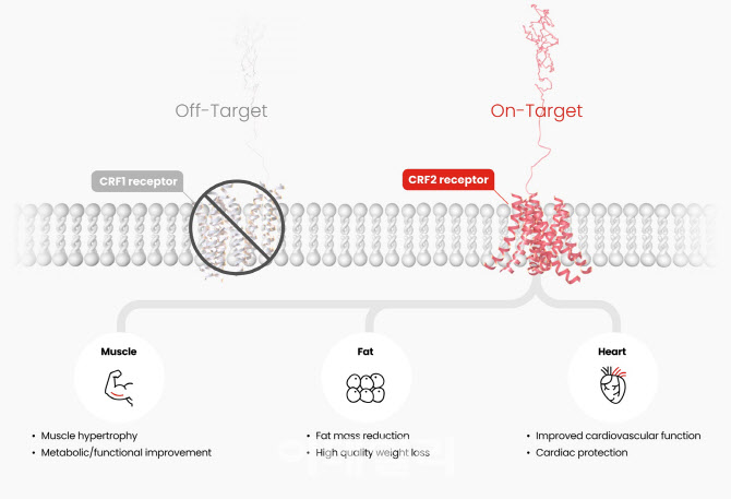 | | HM17321은 CRF2 수용체(On-Target)에만 선택적으로 작용해 근육 증가와 지방 감소를 동시에 유도하는 점이 특징이다. 이를 통해 근육 증대와 대사·기능 개선, 양질의 체중 감량, 심혈관 개선 효과를 동시에 기대할 수 있다. (설명=한미약품) |