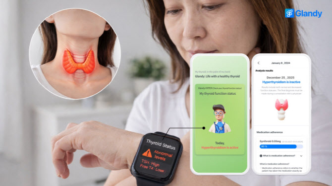 | | 웨어러블 기기로 수집된 심박수 데이터를 활용해 갑상선기능이상 변화를 모니터링하는 타이로스코프의 글랜디(Glandy) (사진=타이로스코프) |