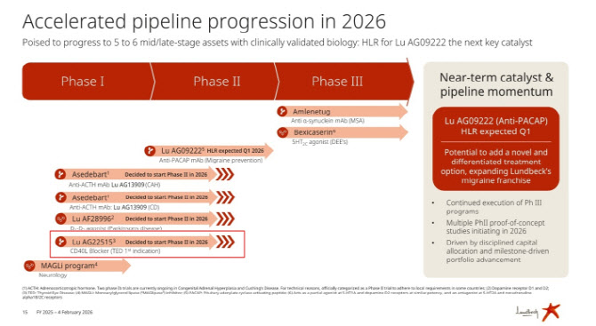 룬드벡, TED 임상 1b상 최종 결과 전 연내 임상 2상 개시 확정 룬드벡은 지난 4일(현지시간) 실적 발표를 통해 “Lu AG22515(APB-A1)의 임상 1b상 데이터가 중등~중증 갑상선안병증(TED) 적응증에서 임상 2상으로의 진입을 지지한다”며 “연내 Lu AG22515의 임상 2상 개시를 결정했다”고 밝혔다.