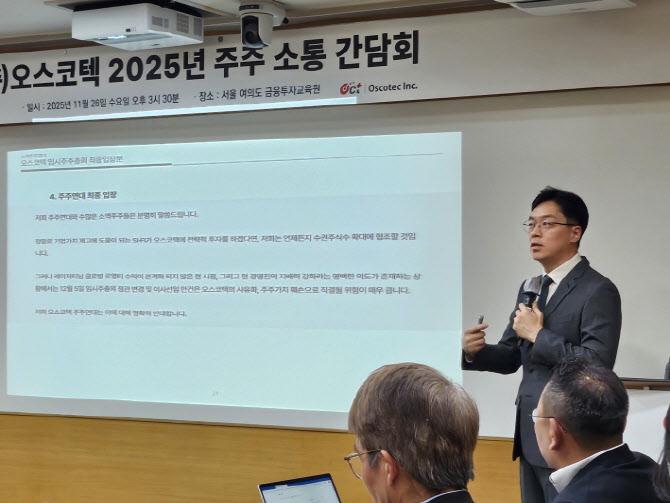 | | 26일 오스코텍 주주소통 간담회에서 신동준 CFO(전무)가 내달 예정된 임시주총과 관련해 설명하고 있다. (사진=김진수 기자) |