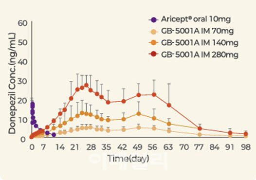 세계 최초 기술...3개월 제형 가능성까지 제시 지투지바이오는 최근 완료된 치매치료제 ‘GB-5001A’ 임상 1상에서 글로벌 시장이 주목할 만한 결과를 내놨다. 1개월 제형으로 개발 중인데, 임상 결과 약효가 98일 이상 유지되는 것과 안전성을 확인했다. 특히 1개월 제형이지만 3개월 제형으로의 가능성까지 제시했다는 게 큰 의미라고 회사 측은 설명했다.