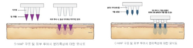 S-MAP은 약물을 함유한 팁 부분이 피부 투여 시 지지체에서 즉각 분리돼 피부에 잔류물이 남지 않고 높은 편의성과 빠른 약물전달이 가능하다.
