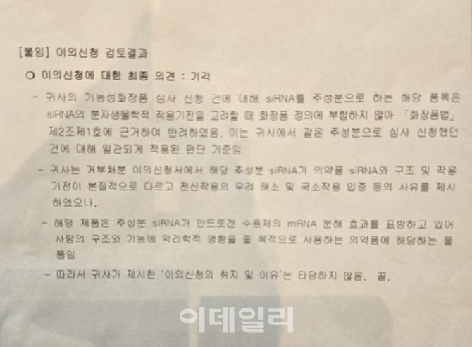 식약처는 이의신청 검토 결과를 통해 “siRNA를 주성분으로 하는 해당 품목은 siRNA 분자생물학적 작용기전을 고려할 때 화장품 정의에 부합하지 않아 화장품법 제2조제1호’에 근거해 반려했다며 “이는 귀사(바이오니아)가 같은 주성분으로 심사 신청했던 건에 대해 일관되게 적용된 판단 기준”이라고 설명했다.