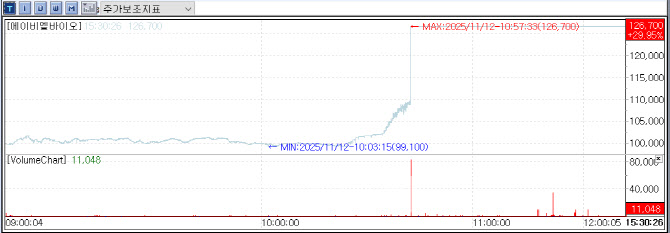 에이비엘바이오, 3.8조 ‘빅딜’…다음 기술수출 후보는? 이날 KG제로인 엠피닥터(MP DORTOR·옛 마켓포인트)에 따르면 에이비엘바이오는 전일 대비 2만9200원(29.95%) 급등한 12만6700원에 장을 마쳤다.