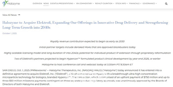 | | 할로자임은 지난 1일 고농도 SC제형 기술 기업 일렉트로파이 인수를 발표했다.(자료=할로자임 홈페이지) |