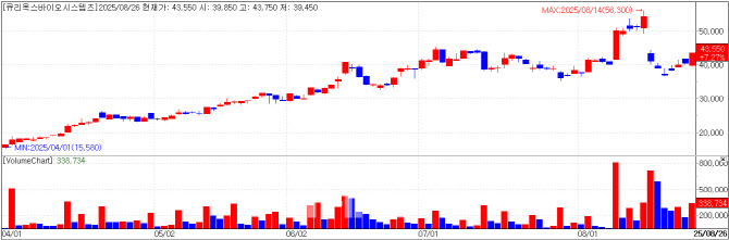 큐리옥스바이오시스템즈, 2대주주 지분매도에도 강세 KG제로인 엠피닥터에 따르면 이날 차세대 생명공학 연구장비 회사 큐리옥스바이오시스템즈는 전일 대비 7.27%(2950원) 오른 4만3550원에 마감했다. 시가총액은 7349억원을 기록했다.