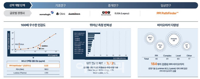 이 플랫폼은 항원 소모량이 기존 방식인 SPR과 BLI 방식 대비 항원과 항체 소모량이 적고 정제 과정이 불필요하다. 월등한 항원 및 황체 빅데이터 생성이 가능하다. 주당 5000개 데이터 생산으로 경쟁사 대비 10배 이상 많다. 단가도 4000억원대의 기존 방식 대비 훨씬 저렴한 130억원대 수준이다. 이를 기반으로 한 비즈니스 모델이 ‘패스파인더’(PathFinder)와 ‘랜드스캐이프’(Path Landscape)다. 패스파인더는 PPI 바이오마커 개발 솔루션이고, 패스 랜드스캐이프는 항체 최적화 및 PPI 빅데이터 생성 솔루션이다.