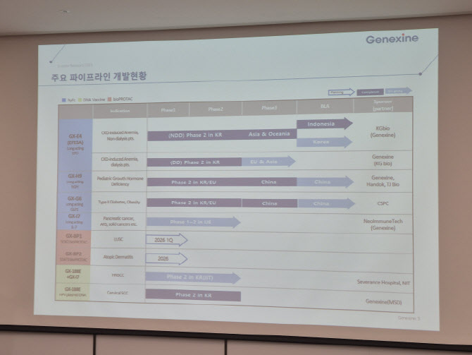 | | 제넥신이 지난달 기업설명회에서 공개한 주요 파이프라인 개발 현황 (사진=김새미 기자) |
