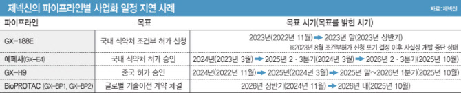 빈혈 치료제 ‘에페사’(GX-E4)의 경우 올해 2분기로 예상됐던 국내 식약처 허가 예상 시점이 내년 2~3분기로 미뤄졌다. 올해로 예상됐던 성장호르몬 ‘GX-H9’의 중국 출시 시점은 내년으로 지연됐다. EPD바이오테라퓨틱스 합병으로 새로 확보한 바이오프로탁(BioPROTAC) 기반 파이프라인의 글로벌 기술이전 목표 시점도 2026년 상반기에서 2026년 내로 조정됐다.