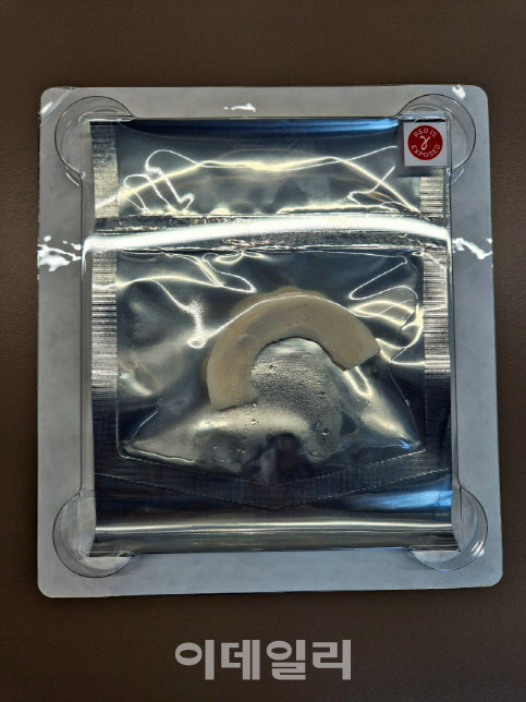 | | 엠젠솔루션이 개발 중인 이종 반월상 연골판 이식재 ‘XMI’ 샘플 (사진=이데일리 나은경 기자) |