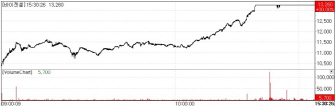 | | 바이젠셀 주가 추이.(자료=KG제로인 엠피닥터) |