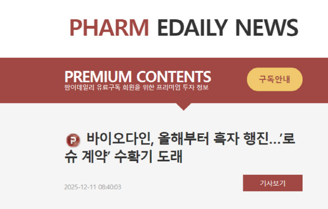 | | 팜이데일리는 11일 오전 8시 40분 [바이오다인, 올해부터 흑자 행진'로슈 계약' 수확기 도래]라는 제목으로 유료 기사를 냈다. (제공=팜이데일리) |