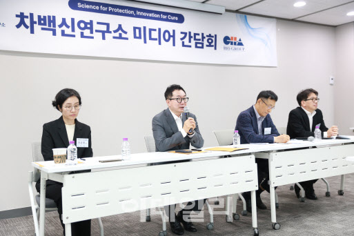 | | 22일 서울 광화문에서 열린 차백신연구소 기자간담회에서 기자들의 질문에 차백신연구소 경영진들이 답하고 있다. 왼쪽부터 전은영 R&D연구소 부소장(상무), 한성일 대표이사, 김상기 최고재무책임자(CFO, 부사장), 정시영 사업개발본부장(전무) (사진=차백신연구소) |