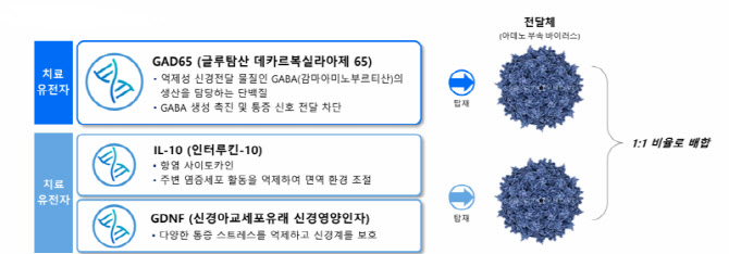 KLS-2031은 2개의 AAV에 3개의 치료 유전자(GAD65·GDNF·IL-10)를 탑재했다. 첫 번째 AAV에는 GAD65 유전자를 탑재해 뇌로 가는 통증신호를 억제하는 작용을 한다. 두 번째 AAV에는 GDNF와 IL-10 유전자를 탑재해 손상된 신경을 보호하고 염증을 막는 작용을 한다.