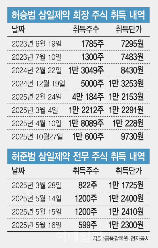 [이데일리 김지완 기자] 삼일제약(000520) 오너 일가가 연이어 자사주를 매입하고 있다. 허승범 회장은 올해만 8만주 넘게 장내에서 주식을 사들였고, 동생 허준범 전무도 매입 대열에 동참했다.