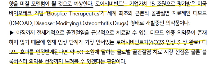 SK증권에선 지난해 1월 보고서를 통해 “로어시비빈트가 약 50조원에 달하는 글로벌 골관절염 치료 시장을 선점할 것”이라며 “블록버스터 의약품도 충분히 가능하다”고 내다봤다.