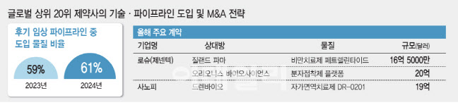 글로벌 컨설팅 업체 딜로이트에 따르면, 글로벌 상위 20개 제약바이오 기업의 후기 임상 단계 파이프라인을 분석했을 때 기술도입 또는 인수합병(M&A) 등을 통해 확보한 ‘외부 도입’ 자산 비중이 2024년 기준 61%에 달하는 것으로 확인됐다.