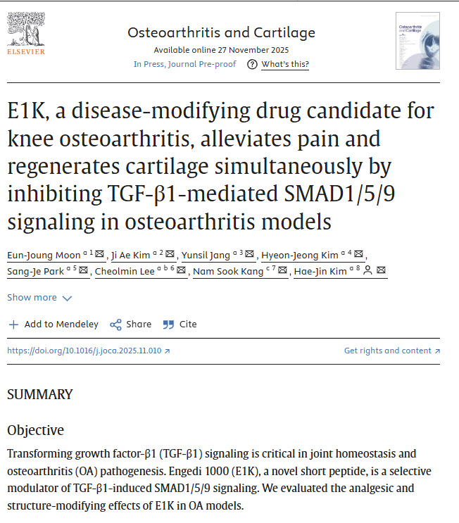 OARSI 공식저널은 골관절염 분야에서 가장 권위 있는 국제학술지로 인정받고 있다. 임상·기초 연구자와 제약·바이오 산업계가 신뢰하는 정보 전달 통로로 알려져 있다. 이번 논문 게재는 E1K의 과학적 타당성과 혁신성이 외부 전문가들에 의해 국제적으로 공인됐다는 의미다.