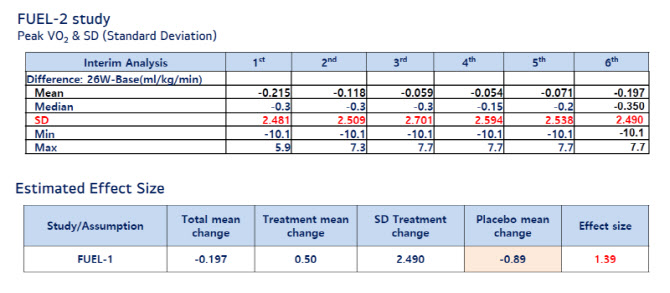 우선 이번 중간분석에서 1차 유효성 평가 지표인 최고산소섭취량(Peak VO₂) 변화의 표준편차(SD)는 2.490으로 집계됐다. 분석 인원은 180명이다.